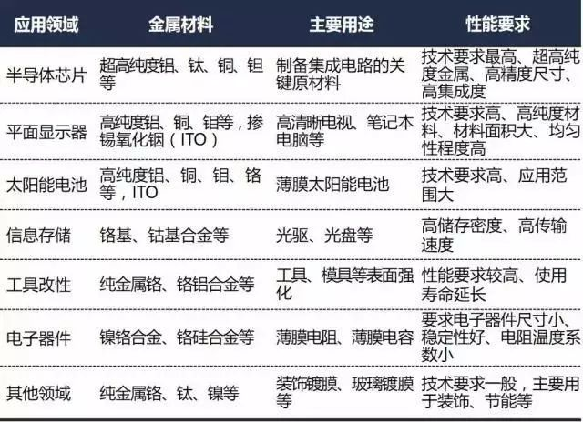3、按應(yīng)用領(lǐng)域分類: 半導(dǎo)體芯片靶材、平面顯示器靶材、太陽(yáng)能電池靶材、信息存儲(chǔ)靶材、工具改性靶材、電子器件靶材、其他靶材